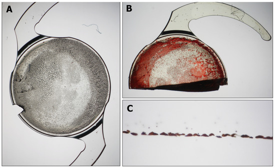 - Ventura, B.V.; MacLean, K.D.; Lira, W.; Oliveira, D.M.; Ventura, C.V.; Werner, L. Microscopic analysis of an opacified OFT CRYL(R) hydrophilic acrylic intraocular lens. Arq. Bras. Oftalmol. 2016, 79, 255–257. [Google Scholar] [CrossRef] [PubMed]