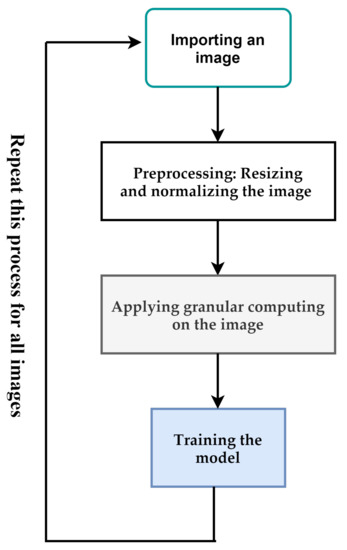 Figure 2 shows the proposed steps for granular computing used in this paper. Considering the above steps, we propose Algorithm 1 for applying granular computing in this paper. In this algorithm, we have used the pre-trained VGG16 architecture to extract features for each granularity. The size of each granular is considered to be 32 × 32. We apply granular computing to the dataset before starting the training process.