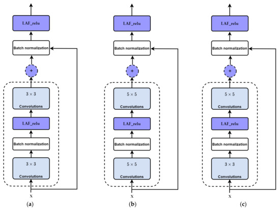 Figure 4), which is inspired by the residual block. The main difference is that the designed block uses learnable activation functions. The block uses a shortcut connection; the input is added to the output of the block to pass gradient updates through the entire network easily and reduce overfitting. The R-block consists of two convolutional layers stacked on top of each other, with the first layer being succeeded by a batch normalization layer and a learnable activation function that is dependent on parameters. Using a parameter learnable activation function helps to reduce time consumption and better learning. Three types of R-blocks are implemented upon the filter size. The filter size of the two convolutional layers in the first R-block is 3 × 3. In the second R-block, the filter size of the two convolutional layers is 5 × 5. The first convolutional layer in the third R-block has a 3 × 3 filter size and the second convolutional layer has a 5 × 5 filter size. We have reduced the number of parameters and computational costs in the X-module by incorporating an additional 1 × 1 convolution in the initial layer, preceding the 3 × 3 and 5 × 5 convolutions. An extra 1 × 1 convolution is also utilized after the max pooling layer.