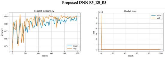 Figure 7 demonstrates that there is a suitable performance for the proposed models and no overfitting compared to GoogLeNet. The DNN R3_R5_R35 model that uses different sizes of convolutional filters achieves the best performance. Here, we compare the proposed architecture with the state-of-the-art image processing architectures in terms of prediction accuracy and loss on test data.