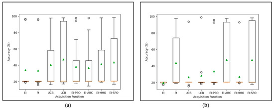Comparison of performance accuracy distribution of VGGNet using difference acquisition function in Bayesian Optimization; (a) VGG-16; (b) VGG-19.
