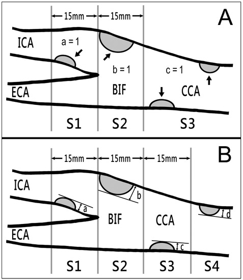 Two types of carotid plaque scores obtained using B-mode ultrasound. (A) sCPSs were calculated by counting the number of areas of the bilateral carotid arteries (the CCA, carotid bifurcation, and proximal ICA) with 1 or more plaques (arrows; presence = 1; absence = 0), with total scores ranging from 0 to 6. (B) hCPSs were computed by summing the maximal plaque thickness (in millimeters) in segments (a) S1 (region of ICA < 15 mm distal to bifurcation), (b) S2 (region of ICA and CCA < 15 mm proximal to bifurcation), (c) S3 (region of CCA 15–30 mm proximal to bifurcation), and (d) S4 (region of CCA > 30 mm proximal to bifurcation) on both sides. BIF, bifurcation; CCA, common carotid artery; ECA, external carotid artery; hCPS, Handa’s carotid plaque score; ICA, internal carotid artery; sCPS, simplified carotid plaque score.