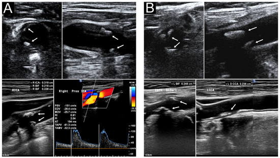 Carotid ultrasound of a 91−year−old woman. Her outpatient sCPS, laboratory sCPS, and laboratory hCPS were 6, 6, and 19.5, respectively. (A) Segmental heteroechogenic plaques (arrows) were detected in the right carotid bifurcation (BIF) and internal carotid artery (ICA) through transverse (upper left) and longitudinal (upper right) POCUS performed in the outpatient department. Laboratory sonography revealed the same segmental plaques more clearly with various plaque thickness (lower left). Color duplex sonography indicated an elevated peak systolic velocity in the ICA (lower right). (B) Segmental plaques (arrows) were detected in the left carotid BIF and ICA through transverse (upper left) and longitudinal (upper right) approach POCUS. Laboratory sonography indicated more segmental plaques extending to the common carotid artery (lower right). BIF, right carotid bifurcation; hCPS, Handa’s carotid plaque score; ICA, internal carotid artery; POCUS, point-of-care ultrasound; sCPS, simplified carotid plaque score.