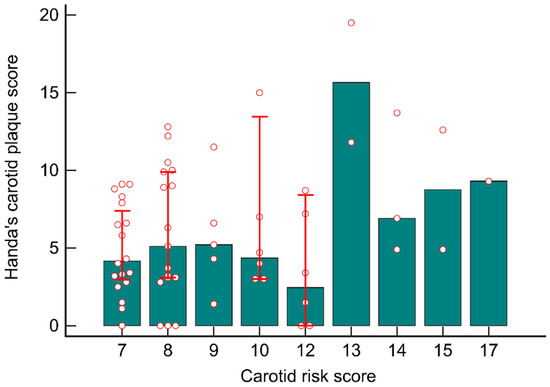 The distribution of the participants’ hCPSs based on their initial carotid risk scores is presented in Figure 4. The median laboratory-derived hCPS was 4.2 (2.8–7.9) in patients with a carotid risk score of 7 (n = 18) and 5.1 (3.0–9.9) in those with a carotid risk score of 8 (n = 17). The patients with carotid risk scores of >12 (n = 8) had significantly higher median laboratory-derived hCPSs than did those with carotid risk scores of ≤12 (10.6 [5.9–13.2] vs. 4.3 [2.9–8.5]; p = 0.005).