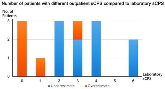 We compared the participants’ outpatient sCPSs with their laboratory sCPSs. sCPS discrepancy between the outpatient and laboratory measurements was noted in 15 of 60 patients (25%), with the difference being only 1 point. These scores were overestimated in 5 patients (laboratory sCPSs of 0, 1, and 3) and underestimated in 10 (laboratory sCPSs of ≥2; Figure 5).