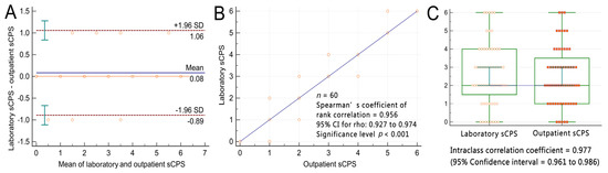 Bland–Altman plots indicated that the mean differences between the participants’ outpatient and laboratory sCPSs were within ±2 standard deviations (i.e., within a 95% limit of agreement) of their laboratory-derived sCPSs (Figure 6A). The bias (mean difference) between the two methods was only 0.08 points. Spearman’s rank correlation coefficient analysis revealed a strong positive, linear correlation between the two methods (r = 0.956; p < 0.001; Figure 6B). A two-way mixed-effects model with absolute agreement ICC analysis indicated excellent reliability between the two methods (ICC = 0.954, 95% confidence interval: 0.925–0.972; Figure 6C). A power exploration for the equivalence between outpatient and laboratory sCPSs using JMP software with a sample size of 60 per group yielded a statistical power of 0.889. This indicates an 88.9% likelihood of detecting a significant difference of 0.083 in sCPS at a significance level of 0.05, with a total sample size of 120 measurements.