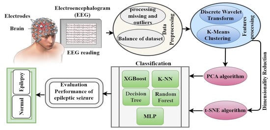 Epilepsy is a common neurological disease that occurs due to the inability of brain neurons to regulate electrical signals in the brain, which leads to seizures. EEG is usually measured and evaluated by neurologists. Therefore, in this study, automated systems were developed to track EEG signals accurately to detect epileptic seizures efficiently. Figure 1 describes the methodology for diagnosing the epileptic seizure dataset. The dataset included all stages, from dataset acquisition, data cleaning, feature extraction, and signal component decomposition via the DWT method. The dataset was divided into subgroups, each containing similar data using K-means. The high-dimensional data was reduced and then put in low-dimensional spaces via PCA and the t-SNE algorithm. Finally, the low-dimensional dataset was classified using five classification algorithms: extreme XGBoost, KNN, DT, RF and MLP classifiers.
