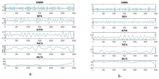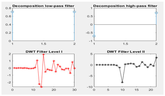 where a changes the time scales of the probing function, and b translates the function through x(t), ψ. If a is greater than 1, then the wavelet function stretches along the time axis; if it is between 1 and 0, then it makes contact with the function. The probing function (ψ) can be any of the different functions, and it takes an oscillating form, which is why it is called a “wave”. The DWT method constrains the contrast in scale and translation with powers of 2. The DWT algorithm decomposes the signals through filter banks. The filter group is used to split the signal into different spectral components, a procedure called sub-band coding. Each stage contains two down-samplers and two filters. D1 details are taken from a high-pass filter and A1 approximation is carried out via the low-pass filter. Choosing the appropriate wave and number of signal decomposition levels is vital in signal analysis via the DWT method. Frequency components determine the number of levels and the selection of levels so that the parts of the signal required to classify the signal are preserved. Given that EEG signals do not have components of frequency above 30 Hz, their number of levels is 5. Therefore, EEG signals are decomposed into D1–D5 details and A5 approximation [20].
