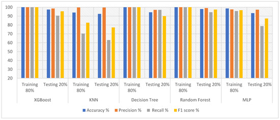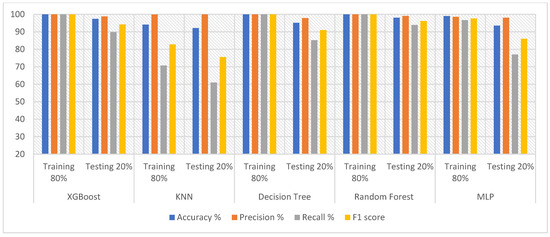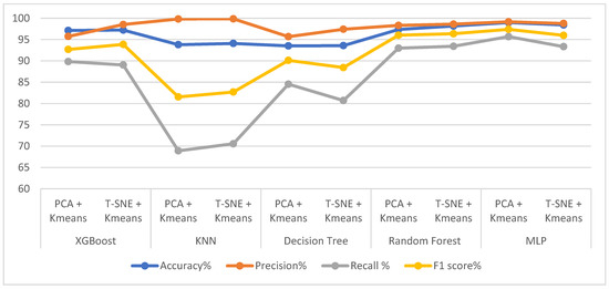 The performances of the proposed systems were evaluated and compared with those in relevant studies. Table 7 describes the accuracy and sensitivity of the proposed systems compared to those reported by previous studies. Our system was proved to be superior to that described by previous studies. The proposed system using DWT and PCA with the RF classifier achieved an accuracy of 97.96%. The proposed system using DWT and t-SNE with random forest attained an accuracy of 98.09%. Finally, the system using K-means with PCA with MLP obtained an accuracy of 98.98%. In previous systems, the accuracy was between 82% and 97.17%. With regard to sensitivity, the system using DWT and PCA with random forest reached a sensitivity of 94.41%. The system using DWT and t-SNE with random forest achieved an accuracy of 93.9%. Finally, the system using K-means with PCA with MLP attained a sensitivity of 95.69%. In comparison, previous systems reached an accuracy ranging from 68% to 93.11%. It is noted that the accuracy of the performance of the previous systems ranged between 83.6% and 97.17%, while the performance of the proposed system was 98.98%. While the previous systems resulted in a recall ranging between 68% and 93.11%, while the proposed system resulted in a recall rate of 95.69%. Thus, the performance of the proposed systems is superior to the performance of the systems in the literature.