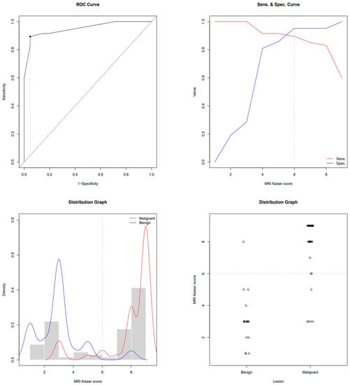 ROC, sensitivity/specificity curves and distribution graphs for MRI Kaiser score; dashed line shows Youden index cut-off (6).