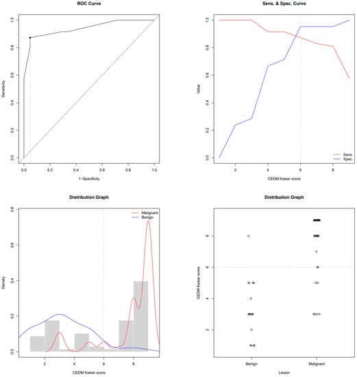 ROC, sensitivity/specificity curves and distribution graphs for CEM-derived Kaiser score; dashed line shows Youden index cut-off (6).