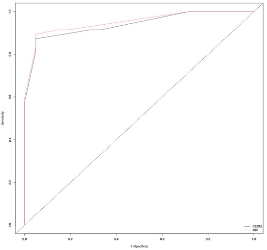 ROC curves depicting differences between Area Under the ROC Curve (ROC-AUC) of magnetic resonance imaging (MRI) and contrast-enhanced mammography (CEM)-derived Kaiser score (KS).