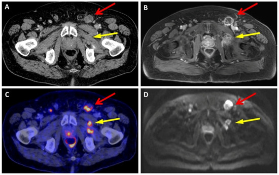 This patient exhibited metastatic lymph nodes in the left inguinal region (indicated by the red arrow) and metastatic soft-tissue lesions in the left M. obturatorius externus (highlighted by the yellow arrow), which could be distinguished using all imaging modalities. (A) is CT, (B) is VIBE, (C) is PET/CT, and (D) is HASTE.