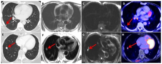 Two melanoma patients (upper row and lower row) presenting with pulmonary metastatic lesions (indicated by the red arrow) in the right lower lobe of the lungs. In the first patient (upper row), the metastasis is visible in the CT scan (A) but not in the HASTE (B) and DWI (C) images. A moderate increase in [18F]FDG uptake is observed in the PET scan (D). The second patient (lower row) had a comparatively larger metastasis, which is visible in the CT scan (E), HASTE (F) image, and DWI (G) image and exhibits intense [18F]FDG accumulation (H).