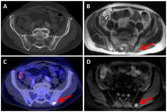 The patient presented with a metastatic bone lesion located in the left ilium (indicated by the red arrow), which is distinguishable in MRI using the HASTE sequence (B), DWI (D), and PET (C) imaging but is not visible in the CT scan (A).