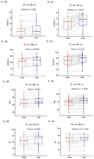 | MS | 67.05 ± 14.45 | 68.68 ± 14.50 | 1.63± 1.89 | 71.47 ± 14.08 | 76.46 ± 15.46 | 4.99± 4.93 | 3.36 (1.17) ** | 2.583 (1.21) * |