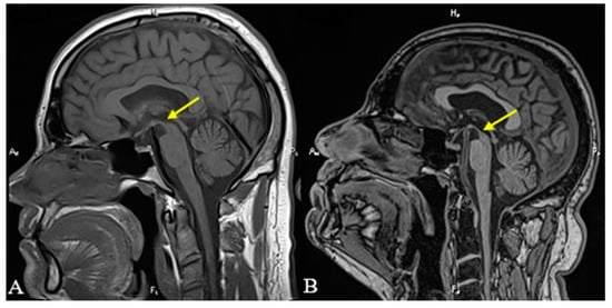 T1-weighted sagittal MRI revealing the superior margin of the midbrain (yellow arrows). Notice the convex superior margin of the midbrain that could be seen in 2019 (A) and the concave appearance in 2022 (B), the so-called “hummingbird” sign.