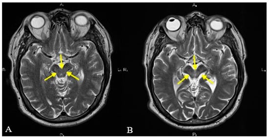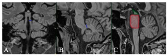 The “Mickey Mouse” sign, which is also seen on axial images, is determined by the reduction of the anterior–posterior diameter of the midbrain and is associated with the thinning of the cerebral peduncles, thus giving rise to the “face of Mickey Mouse” (see Figure 2) [17,18].