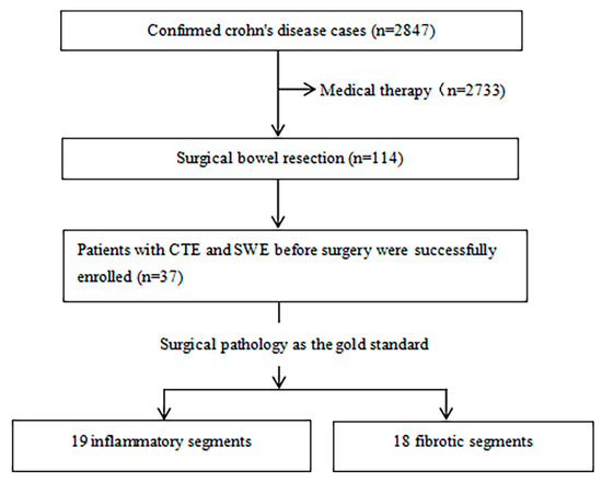 In recent years, new cross-sectional imaging techniques that study CD have evolved, and have high accuracy [7]. Ultrasound imaging and computed tomography (CT) have high sensitivity and specificity in the identification of small bowel and colon lesions [8]. Histopathological assessments of inflammation and fibrosis in surgically resected specimens have been performed to validate noninvasive imaging modalities [9]. Research has shown that these two imaging techniques may help distinguish between inflammatory and fibrotic intestines [10]. Ultrasound imaging, a noninvasive method for intestinal lesions, is recommended to be used to detect CD at its first presentation, and to assess CD location, activity and possible complications [11]. A novel ultrasonic imaging technology called shear-wave elastography (SWE) has also evolved. SWE can quantitatively analyze tissue stiffness by measuring shear wave velocity [12]. This technology expands the application of ultrasound to distinguish CD intestinal wall phenotypes, especially real-time two-dimensional shear wave ultrasound elastography (2D-SWE). Compared with traditional strain elastography, 2D-SWE has a lower operational dependence, higher repeatability and relatively objective results [13,14]. Several studies on CD in animal models and human specimens demonstrated that SWE can differentiate between inflammatory and fibrotic lesions [15,16,17]. Computed tomography enterography (CTE) is sensitive to the detection of small bowel disease in CD, and is comparable to magnetic resonance enterography [18]. The studies have found an association between CT findings and inflammatory lesions, including bowel wall thickening, mural hyperenhancement, and comb signs [19,20]. The American College of Radiology has used CTE as an important method for the diagnosis of CD [21]. Several CTE scoring systems have been proposed to study inflammation [22].