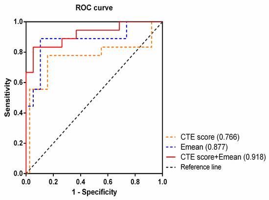 The metrics in discriminating between inflammation and fibrosis lesions. The ROC curve shows the combination of CT enterography score (CTE) and the average value of Shear-wave elastography (Emean) is superior to either one alone in discriminating between inflammation and fibrosis lesions in Crohn’s disease.
