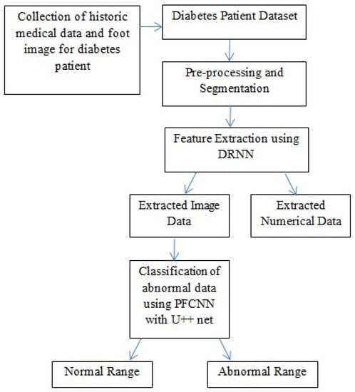 The technique presented in this research endeavors to identify the risk of diabetic foot ulcers in patients with diabetes through the analysis of foot ulcer images, as illustrated in Figure 1. In this study, the DFU2020 dataset was utilized to extract the feature set from foot ulcer images and classify them as either normal or abnormal for patients with diabetes. The dataset consisted of both numerical and image data, which were pre-processed and segmented, and feature vectors were extracted using advanced deep neural networks, including deep recurrent neural networks (DRNN) for numerical data and deep neural networks (DNN) for image data. To detect the level of diabetes, the numerical feature vectors were analyzed, and if the diabetes range was higher, appropriate treatment was provided. The diabetic foot images of the patients were subsequently employed for the classification task, aiming to predict the pathogenesis of foot ulcers. However, if the diabetes range was normal, the data were updated in the database for future reference to identify nerve damage and predict the development or progression of foot ulcers. The foot ulcer images of patients with abnormal diabetes ranges were classified using a pre-trained fast convolutional neural network (PFCNN) with U++net. The classification results helped to predict the risk of foot ulcers. Figure 1 illustrates the flow schematic diagram for foot ulcer classification and provides a comprehensive overview of the entire process.