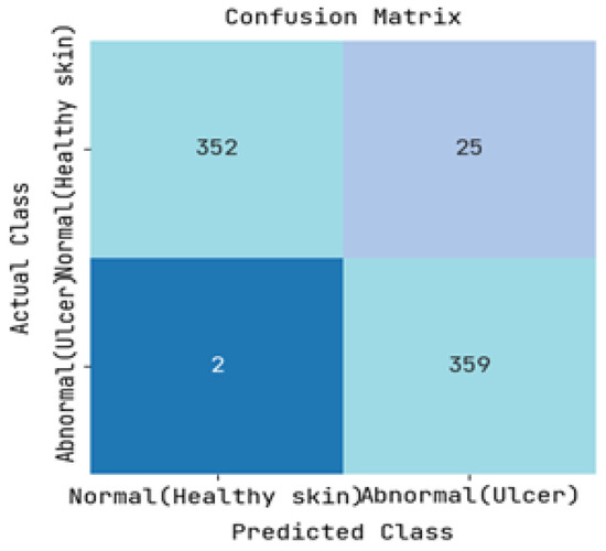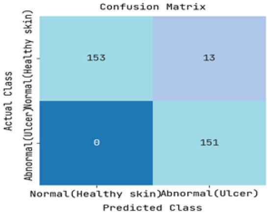 The DFUC2021 dataset was utilized to study the pathology of diabetic foot ulcers, with a specific focus on infection and ischemia. The dataset comprises a total of 15,683 DFU images, out of which 5955 images were used for training, 5734 images were used for testing, and the remaining 3994 images were left unlabelled. The study’s primary objective was to assess the performance of an image-based risk prediction model of diabetic foot ulcers. The results of this performance analysis are showcased in this section, with Figure 5 and Figure 6 presenting the confusion matrices for diabetic range detection in the test data and train data, respectively. These matrices provide a clear overview of the model’s accuracy in predicting the diabetic range, highlighting the number of true positives, false positives, true negatives, and false negatives.