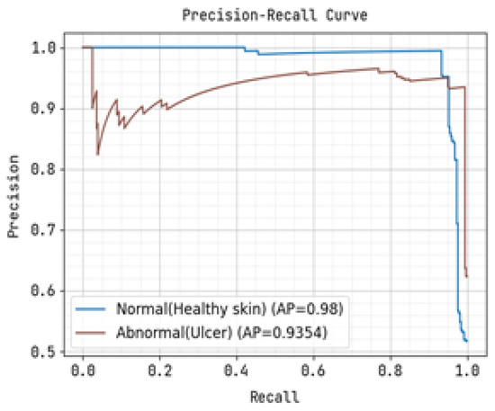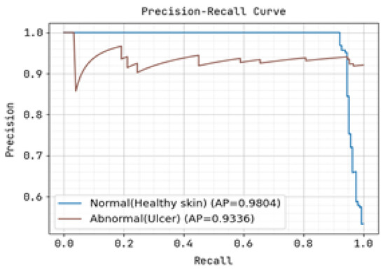 The ROC curve and precision-recall curve were generated to distinguish between normal and abnormal foot ulcers through the feature extraction and classification process based on the testing data of foot ulcers, as shown in Figure 7 and Figure 8, respectively. Similarly, Figure 9 and Figure 10 depict the ROC curve and precision-recall curve for distinguishing between normal and abnormal foot ulcers through the feature extraction and classification process based on the training data of foot ulcers.
