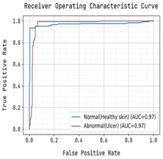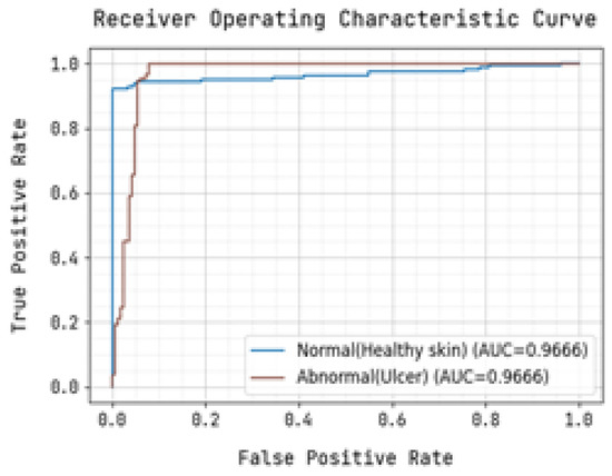 The precision-recall curve and the receiver operating characteristic (ROC) curve used to classify diabetic foot ulcers using foot ulcer training data are determined in Figure 9 and Figure 10, respectively. Table 2 displays the input foot ulcer images used for training, and presents the pre-processing and segmentation steps, followed by the resulting classified output.