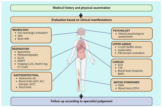 Clinical approach to paediatric Long COVID. Abbreviations: 6MWT = six-minute walking test; DLCO = diffusion lung capacity for carbon monoxide; LUS = lung ultrasound; CT = computed tomography; EMG = electromyography; CPK = creatine phosphokinase; EEG = electroencephalogram; MRI = magnetic resonance; ECG = electrocardiograph; TTE = transthoracic echocardiography; BNP = brain-derived natriuretic peptide; US = ultrasound; AST = aspartate aminotransferase; ALT = alanine aminotransferase; GGT = gamma-glutamyl transpeptidase.