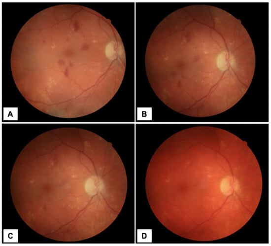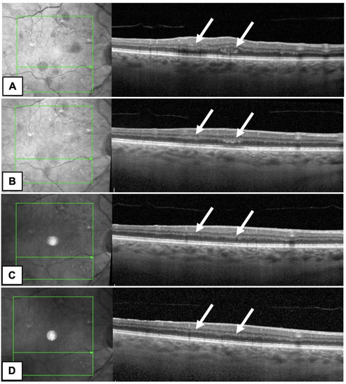 OCT B-scans of the patient’s RE showed intraretinal hemorrhages marked by white arrows ((A)—first day after diagnosis, (B)—after a month), which resolved during follow up ((C)—after 3 months, (D)—after 5 months).
