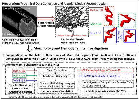 However, to the best of our knowledge, there is no existing study to investigate the performances of hemodynamics such as the WSS and oscillatory shear index (OSI) concerning CAs in the MTs. The specific study [13] compared the blood flow rates in the circle of Willis (CoW) and CoW morphology in sixty-four twins (i.e., 19 MTs and 13 dizygotic twins) using transcranial color-coded sonography, which is similar to a different study [14] which included more MT cases. The difference of CoW morphologies between twins was observed while the specific hemodynamic features (e.g., OSI and WSS) were not investigated. Another study [15] involved detailed studies in configurations and hemodynamics of CoWs of six pairs of MTs while not associated with CAs. Other studies focused more on reporting CA discoveries in MTs based on scanned digital subtraction angiography (DSA) images [16,17,18,19,20,21,22,23,24] rather than investigating specific hemodynamic factors resulting in CAs in the corresponding arteries and CAs. Thus, to facilitate the understanding of morphology and hemodynamics in CAs involved in the MTs, and to enrich the case studies in the CA research community, a careful study on the pathophysiology of CAs in MT models is extremely valuable.