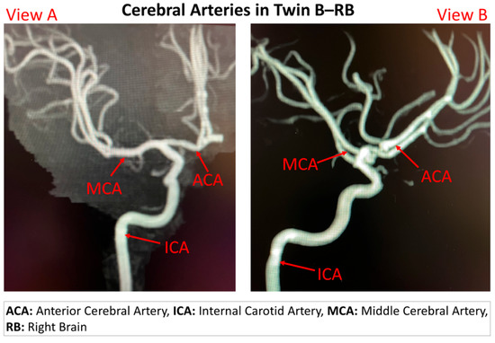Cerebral artery system in twin B-RB based on collected MRI images from two viewing perspectives (i.e., view A and view B).