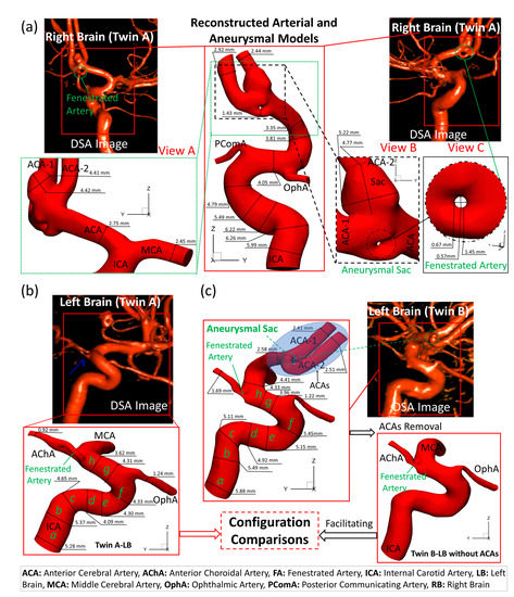 Morphologies and dimensions of cerebral arteries and aneurysms in the MTs. (a) Specific arterial configurations and dimensions in twin A-RB, with an aneurysmal sac (~5 mm) (view B) and a fenestrated artery (view C); (b) Dimensions and configuration of the arteries in twin A-RB; (c) Complete arterial and aneurysmal geometries with a small aneurysm bleed located at the ACA bifurcation (left of (c)) in twin B-LB, and an arterial model (i.e., right of (c)) with ACAs virtually removed based on the left complete model to facilitate the morphological comparisons in the MTs.