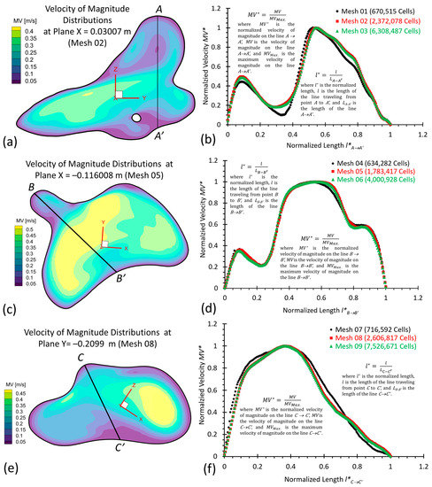 where is the maximum magnitude of velocity along selected lines A–A′, B–B′, and C–C′ shown in Figure 5a,c,e, respectively. is the magnitude of velocity along selected lines from , , and of cut-planes (i.e., plane X = 0.03007 m, plane X = −0.116008 m, and plane Y = −0.2099 m), respectively. denotes the length of the location of velocity vectors traveling from A to A′, B to B′, and C to C′, accordingly. are the lengths of lines A–A′, B–B′, and C–C′, respectively.