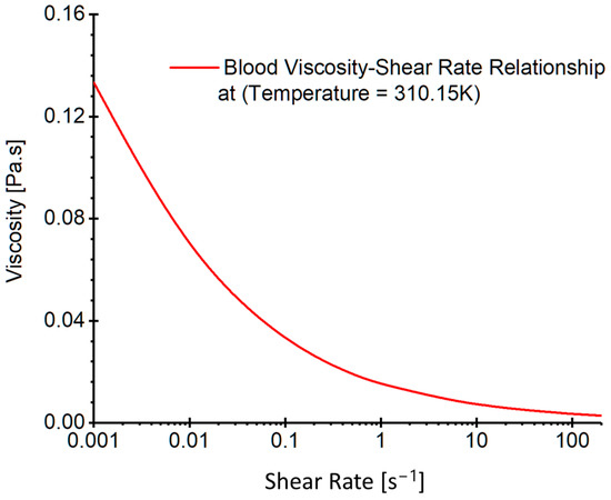 where , , , and are the velocity vector, pressure, gravity vector, and blood density, respectively. In this study, a blood density of 1050 kg/m3 is employed for hemodynamic modeling, and blood viscosity profiles (see Figure 6) were determined by a non-Newtonian viscosity model at a normal body temperature of 310.15 K. Such a profile was plotted based on the blood viscosity model which considered blood non-isothermal features and shear-thinning properties in our previous publication [25]. Specifically, the model is expressed by, i.e.,