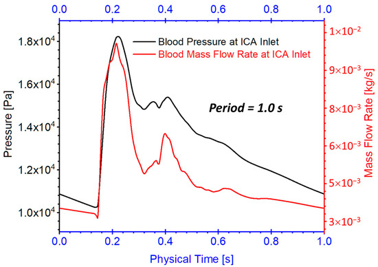 Three arterial models in twin A-RB, twin A-LB, and twin B-LB were employed to investigate hemodynamic characteristics in the MTs. Specifically, one pulsatile flow rate waveform with a period of 1.0 s obtained from the 1D model [7,8,29] was adopted as the flow rate conditions at the ICA inlet (see Figure 7), mimicking pulsatile blood flow conditions. The pressure outlet was assumed at outlets flow condition, i.e., ophthalmic artery (OphA), posterior communicating artery (PComA), anterior choroidal artery (AChA), ACA, resighted with a gauge pressure of 0. The backflow direction at the outlets was determined by the flows in the adjacent cells. Additionally, the stationary, non-slip, and no-penetration condition was assumed for the arterial walls.