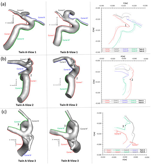 To match the extracted portion (ICA mainly) of the arterial model in twin A-LB and avoid blocking the view of MCA branches, the ACAs in twin B were removed (right corner of Figure 3c) purely for geometric comparisons. Specifically, three sets of projective images (i.e., view 1, view 2, and view 3) and associated outlines (i.e., curve I and curve I′, curve II and curve II′, curve III and curve III′, and curve IV and curve IV′) (see Figure 8) of the geometries from three perspective directions (YZ-plane, XZ-plane, and XY-plane) were selected for comparisons, with the corresponding benchmarked point, 1, 2, and 3, respectively. It can be found that although twin A and twin B show similar outlines at local regions near the benchmarked point, most parts of the cerebral arterial configurations show subtle differences from each other significantly.