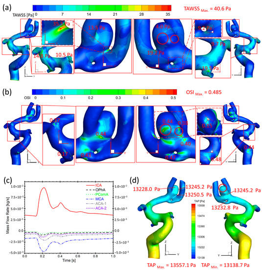 Hemodynamic characteristics in the arterial and aneurysmal models in twin A-RB. (a) Specific TAWSS distributions on the model walls in which relatively high TAWSS locations were enlarged and highlighted; (b) Detailed OSI distribution contours on the model walls in which relatively high OSI locations were enlarged and highlighted; (c) Mass flow rates at ICA, OphA, PComA, MCA, ACA-1, and ACA-2 along the blood cardiac flow period (1.0 s); (d) TAP distributions on the arterial walls in which the maximum and minimum TAP, and some local sites with relatively high TAP, were marked.