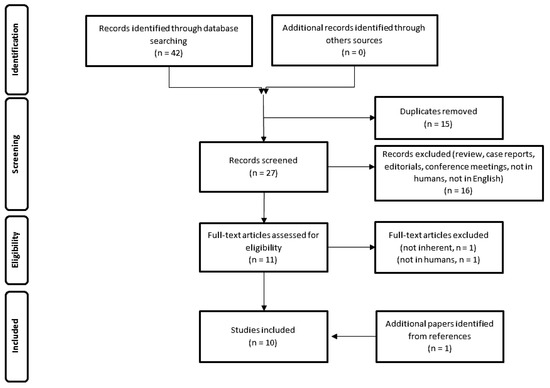 The resulting PRISMA search strategy is shown in Figure 1. From the systematic literature search, 10 papers were selected [14,15,16,17,18,19,20,21,22,23], for an overall number of 335 patients affected by MM or SSM and submitted to both MET and FDG–PET. Table 1 summarizes the main findings of the selected manuscripts.