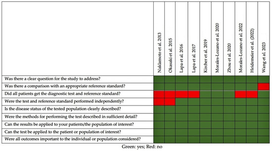 Selected imaging studies were analyzed using a modified version of the Critical Appraisal Skills Programme (CASP) (https://casp-uk.net/aboutus, accessed on 27 March 2023) checklist for diagnostic test studies. Critical appraisal was performed by two reviewers (L.F. and L.E.), and discrepancies, if any, were solved by discussion with the other authors.