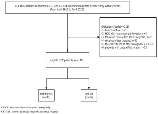 The institutional review board approved this retrospective study, and informed consent was waived. From April 2015 to April 2020, a total of 234 HCC patients receiving radical liver segmentectomy were recruited. The inclusion criteria were as follows: (1) histopathologically diagnosed HCC and (2) contrast-enhanced CT and abdominal MRI examination conducted within 2 weeks before hepatectomy. Exclusion criteria included the following: (1) tumor rupture; (2) HCC with macrovascular invasion (main portal vein or hepatic veins); (3) a follow-up period for patients of less than two years; (4) patients who received radiotherapy, chemotherapy, interventional therapy, or comprehensive therapy before postoperative recurrence; (5) the coexistence of other malignancies; and (6) patients with unqualified images. Finally, 119 patients were included, and the detailed flow chart of the patient selection is presented in Figure 1. At a ratio of 7:3, HCC patients were randomly assigned to either the training cohort (n = 83) or the validation cohort (n = 36).
