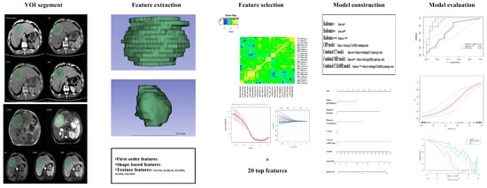 The workflow of radiomics analysis is illustrated in Figure 2. Two radiologists with vast experience in liver imaging, reader 1 (Q.W.) and reader 2 (Y.S.), manually delineated the volumes of interest (VOIs) based on the whole tumor on each transverse slice for five MRI sequences (T2WI, T1WI, AP, PVP, DP) and four CT phases (precontrast, arterial, venous, delay) using ITK-SNAP (http://www.itksnap.org/pmwiki/pmwiki.php accessed on 12 April 2023). To ensure minimal bias, a trained radiologist with over a decade of expertise in abdominal imaging, reader 3 (HF.L.), meticulously verified the VOIs.