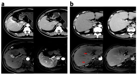 Discrepant MRI and CT findings in HCCs. (a) HCC patients (recurrence within 18 months after hepatectomy), 60 years, a 1.9 cm HCC; enhancement in the pseudocapsule was observed in the AP, and delayed phase on MRI while the appearance was not observed on CT. (b) HCC patients (ER group), male, 52 years old, 0.6–0.8 cm HCC lesions with wash-in in the AP (red arrow) and partial wash-out in the PVP at MRI; these lesion did not show wash-in and wash-out at CT. PVP = portal venous phase; AP = arterial phase.