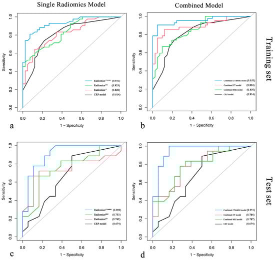 Comparison of ROC curves for single radiomics models vs. clinical–radiological–pathological (CRP) model and for combined models vs. CRP model in the training cohort (a,b) and the test cohort (c,d).