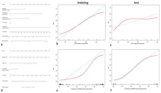 CRP nomogram (a) and combined CT and MRI nomogram (d). Calibration curves for the CRP nomogram (b,c) and combined CT and MRI nomogram (e,f) for the training cohort and test cohort. On the y-axis is the actual outcome of early recurrence of HCC, and on the x-axis is the predicted outcome. The perfect performance of the ideal model is represented by the blue lines. The red lines represent the performance of the model, of which a closer fit to the blue line indicates better prediction performance.