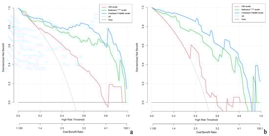 Decision curve analysis (DCA) of the clinical usefulness assessment of the RadiomicsCT&MRI model, CRP model, and combined CT and MRI model in the training cohort (a) and the test cohort (b). The y-axis represents the net benefit, and the x-axis represents the threshold probability. The combined CT and MRI (blue line) achieves more net benefit than the RadiomicsCT&MRI model (green line), CRP model (red line), treat-all strategy (gray line), and treat-none strategy (horizontal black line) across the majority of the range of threshold probabilities.