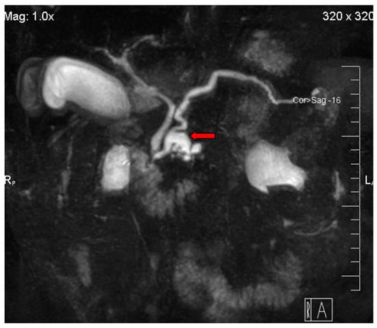 A mixed-type IPMN (arrow) is seen in the pancreatic head on this MRCP image.