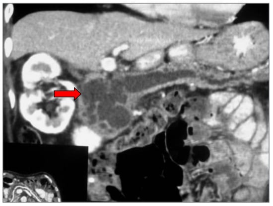 - Tamura, K.; Ohtsuka, T.; Ideno, N.; Aso, T.; Kono, H.; Nagayoshi, Y.; Shindo, K.; Ushijima, Y.; Ueda, J.; Takahata, S.; et al. Unresectable pancreatic ductal adenocarcinoma in the remnant pancreas diagnosed during every-6-month surveillance after resection of branch duct intraductal papillary mucinous neoplasm: A case report. JOP J. Pancreas 2013, 14, 450–453. [Google Scholar]