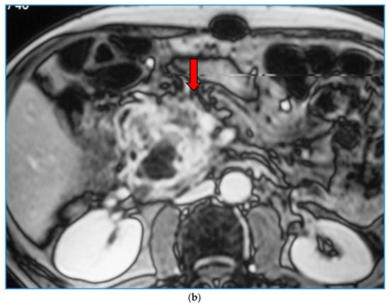 - Yamada, Y.; Mori, H.; Hijiya, N.; Matsumoto, S.; Takaji, R.; Ohta, M.; Kitano, S.; Moriyama, M. Intraductal papillary mucinous neoplasms of the pancreas complicated with intraductal hemorrhage, perforation, and fistula formation: CT and MR imaging findings with pathologic correlation. Abdom. Imaging 2012, 37, 100–109. [Google Scholar] [CrossRef]