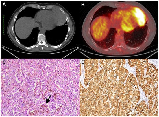 A 53-year-old man with an unremarkable past medical history presented to the local emergency room complaining of breathlessness. The chest X-ray showed gross widening of the mediastinum with a well-defined homogenous radio-opaque shadow. A contrast-enhanced chest computerized tomography (CT) scan demonstrated a mediastinal mass with a size of 10.5 cm × 4 cm, strictly adherent to the diaphragm and pericardium (Figure 1A). The diagnostic work-up was concluded with a positron emission tomography (PET) scan that showed pathological uptake only in the mass with a standard uptake volume (SUVmax) of 20.8 (Figure 1B). Because this finding was suggestive of a primary neoplastic process of the anterior mediastinum, likely a thymoma, surgery was planned. Through a left mini-thoracotomy approach, thymectomy en bloc with partial pericardium resection and an atypical resection of the left lower lobe were performed. The procedure was uneventful, and the patient was discharged on the fifth postoperative day. The gross specimen revealed a solid encapsulated mass with a maximum diameter of 10 cm, which was brownish at the cut surface. Histologically, the tumor was composed of atypical epithelioid cells, with large eosinophilic cytoplasm, prominent nucleoli, and a solid growth pattern. Abundant melanic pigment was also present (Figure 1C). There were thymic remnants at the periphery of the tumor. The immunophenotypic panel showed strong positivity for melanocytic differentiation markers: S100, Melan A/MART1 (Figure 1D), HMB45, and SOX10. Immunoreactions for cytokeratin, CD5, CD117, p40, PAX8, and neuroendocrine markers were negative. No mutations of BRAF were detected by the real-time PCR method and EWSR rearrangement by fluorescence in situ hybridization (FISH). An attempt was made to carry out more in-depth molecular characterization using next-generation sequencing methodology, but the characteristics of the sample (extensive necrotic phenomena) did not allow for adequate DNA quality for analysis. The final diagnosis of malignant melanoma was made. No primary cutaneous and non-cutaneous melanomas were detected upon dermatological, ophthalmological, and gastroenterological examination. After six months, a polypoid endoluminal mass of 4 cm in the distal ileum was identified during radiological follow-up. Surgical resection was performed. The final pathological examination was conclusive for malignant melanoma. Following a multidisciplinary discussion, considering the radicality of the surgical interventions, it was decided not to perform adjuvant treatment, and the patient is under follow-up. Currently, the patient is still alive and free of disease seven years after the first surgery.
